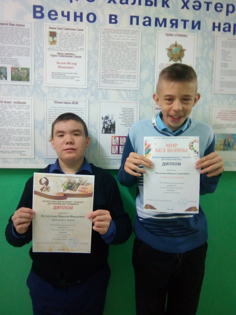 Обучающиеся 8а класса участвовали в интернет- конкурсе "Я помню! Я горжусь!" По итогам конкурса Кутлугулов Муртаза занял 1 место в номинации"Художественное слово", а Малыгин Никита- 2 место в номинации "Изобразительное искусство".Подготовила детей к конкурсу учитель Кулмухаметова Ф.М.Поздравляем мальчиков с достойной победой!