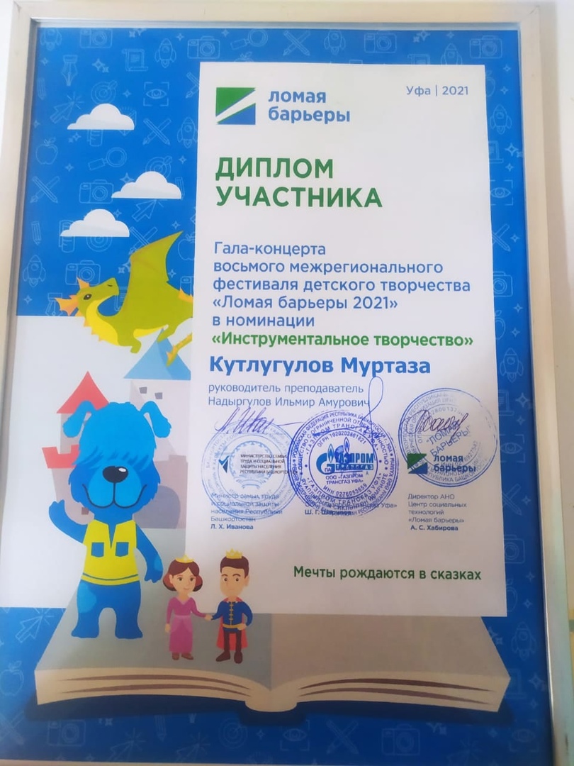 В этом концерте принял участие обучающийся 11а класса Кутлугулов Муртаза, который сыграл на сцене Конгресс-холла на курае. Он является победителем в номинации "Инструментальное искусство". Его подготовил преподаватель ДШИ Надыргулов И.А.