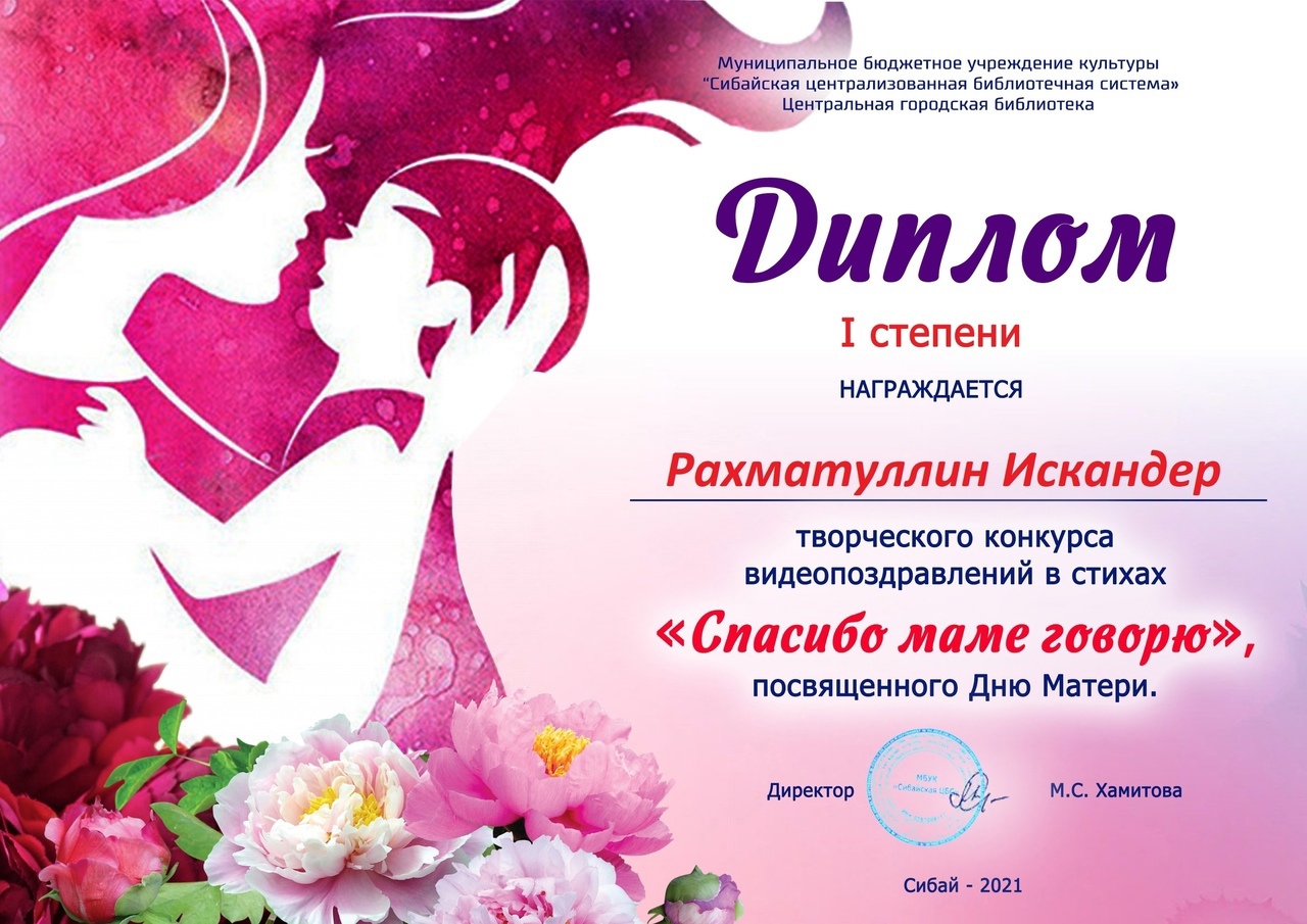 Обучающийся 6 класса Рахматуллин Искандер награжден Дипломом I степени за участие в конкурсе видеопоздравлений "Спасибо маме говорю"